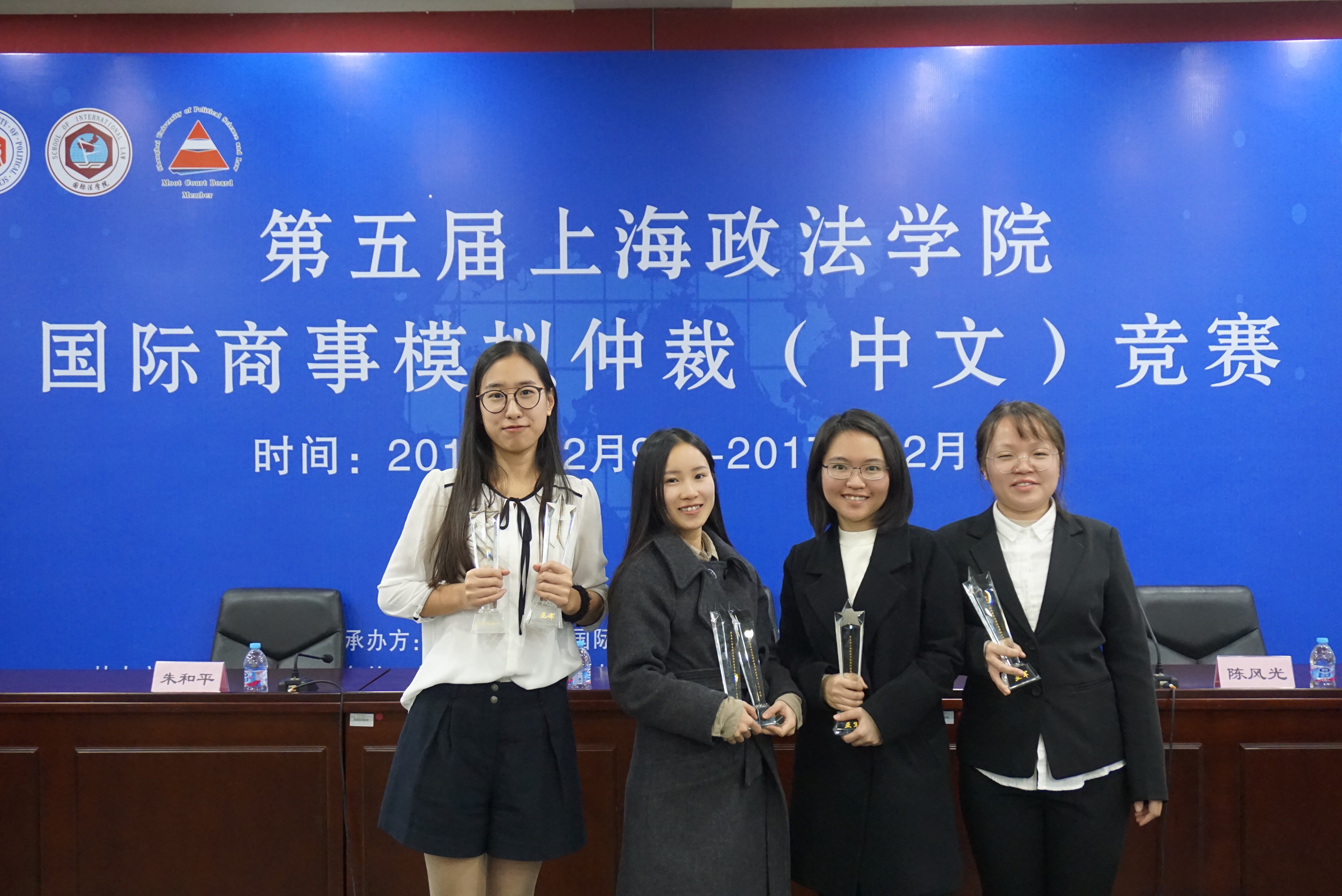 陈风光宣读获得本届商事仲裁竞赛亚军名单,并为获奖队伍颁奖。关保英宣布获得本届商事仲裁竞赛的冠军队伍,并为其颁奖。徐国建宣读最佳代理人名单,并由刘志强、朱和平为获得本届竞赛最佳代理人个人奖项的同学颁奖。