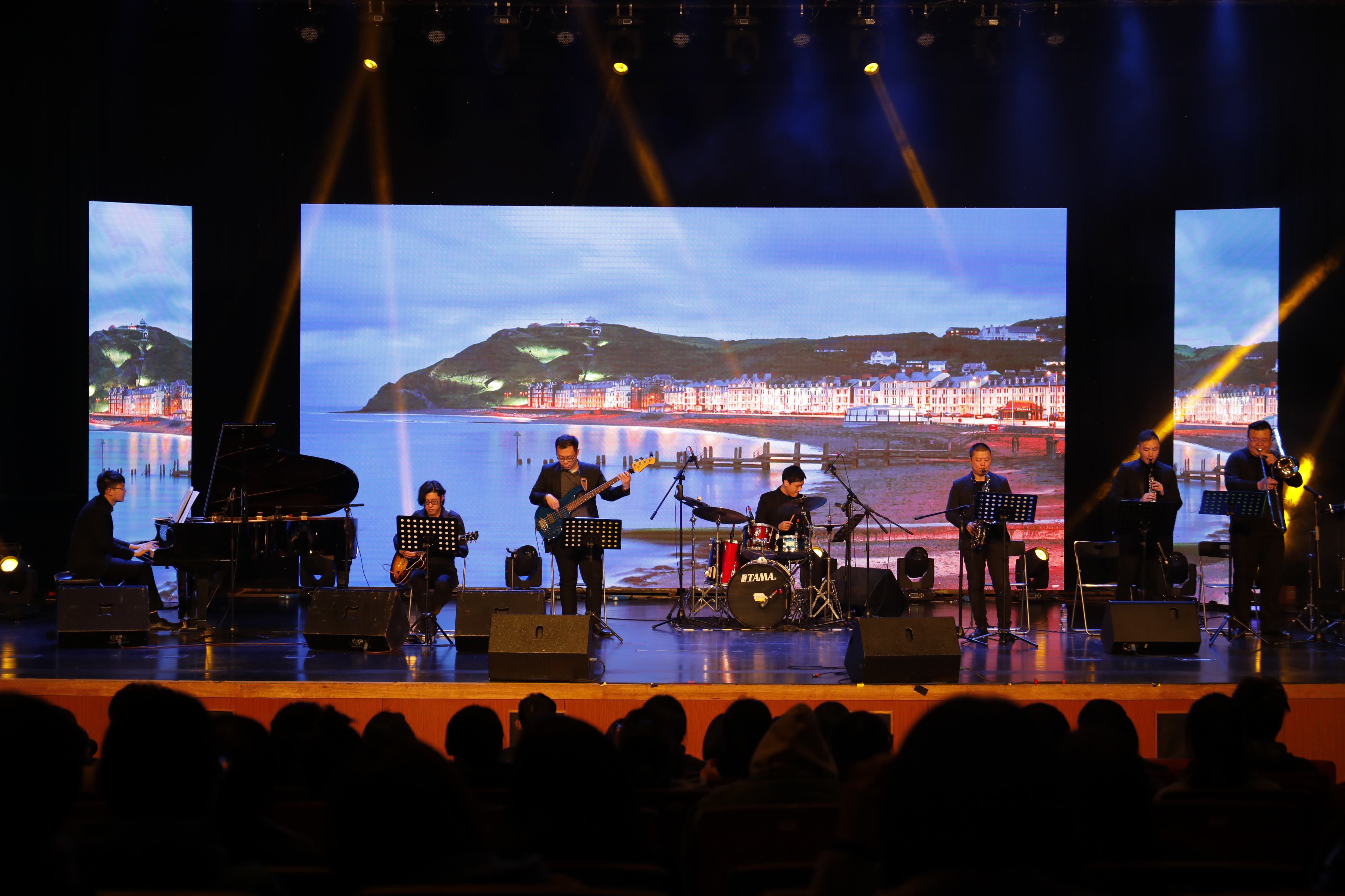 聚光灯下,灵动的音符从钢琴家手指之间跃动而出,使观众沉醉在这浪漫而深情的曲调和氛围之中。随后,乐团再次点燃现场气氛,热情演奏了 The chicken 等乐曲。热情的旋律和摇曳的节拍点燃了师生的热情,使灯火通明的学生礼堂显得无比热情动人。
