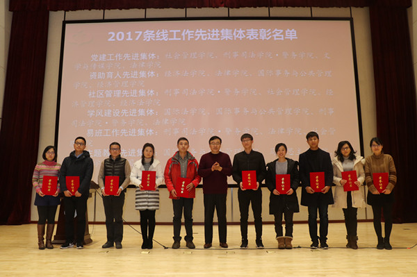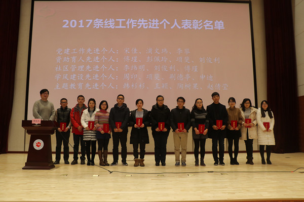 周银娥在讲话中肯定了学工队伍2017年开展的各项工作,对一年来辛苦工作的学工队伍表示感谢。她强调,面对十九大胜利召开的历史性机遇,我校学生工作应因事而化、因时而进、因势而新,学生工作者必须牢记自己的初心和使命,为学生谋成才,为国家育栋梁。她指出,在新的时代背景下,学生工作者需进一步提升精神风貌,把握好工作方向,丰富学生工作载体,谋求学生工作的新发展。