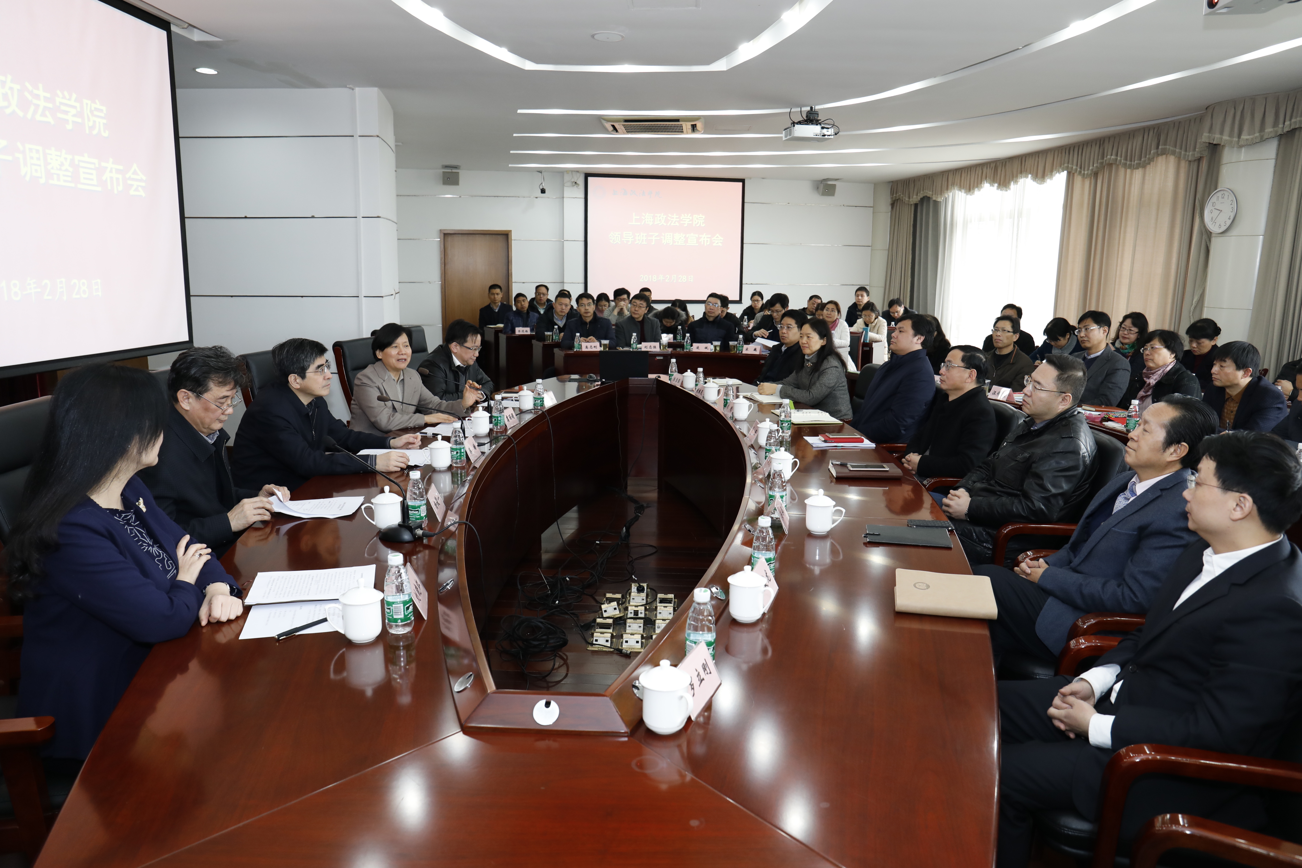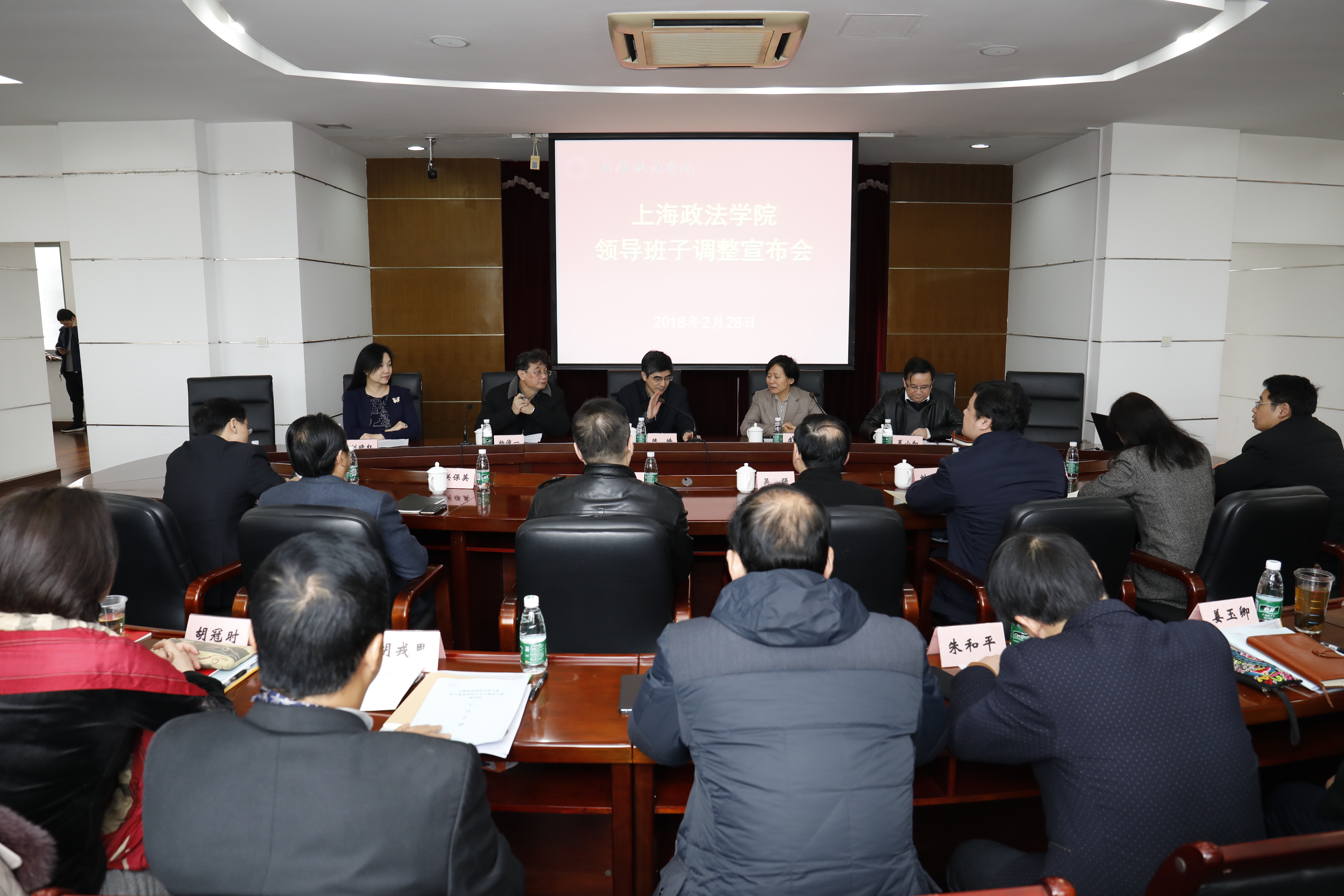 2月28日上午,上海政法学院领导班子调整宣布会在求实楼513会议室召开,会议宣布上海市委、市政府关于上海政法学院领导班子调整的决定。市委组织部副部长陈皓,市教卫工作党委书记虞丽娟,市委组织部、市教卫工作党委组织干部处有关领导出席会议,上海政法学院领导班子成员、全体中层干部和民主党派代表、教师代表等参加会议。会议由虞丽娟同志主持。