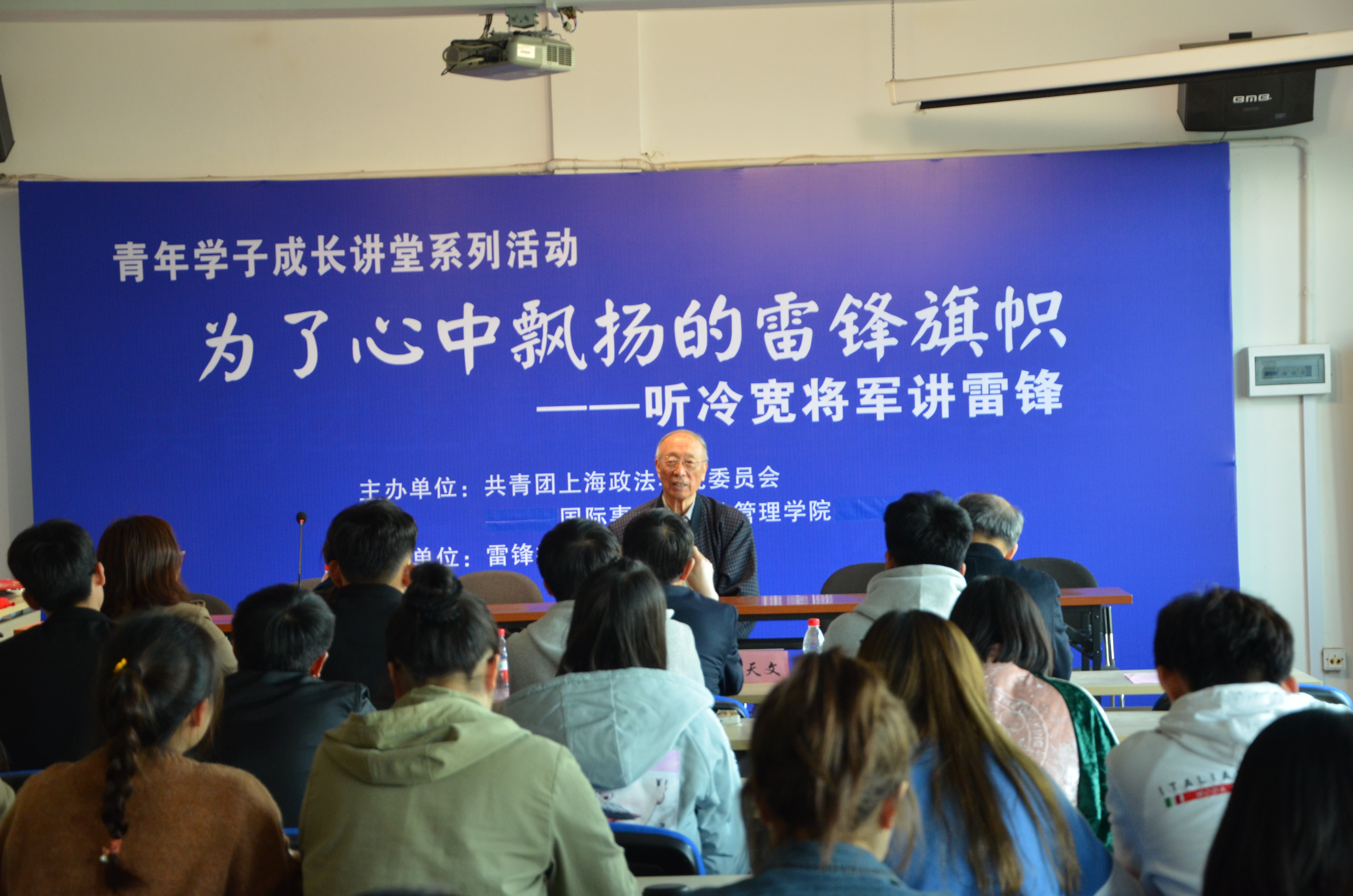 3月13日下午,由共青团上海政法学院委员会和国际事务与公共管理学院主办,上海政法学院雷锋社承办的以“为了心中飘扬的雷锋旗帜——听冷宽将军讲雷锋”为主题的青年学子成长座谈在学生活动中心206举行。本次座谈会邀请到雷锋生前战友、中国人民解放军海军原副政治委员、中国社会福利基金会学雷锋基金管委会名誉主任冷宽中将主讲,雷锋社60余名学生参加了座谈。