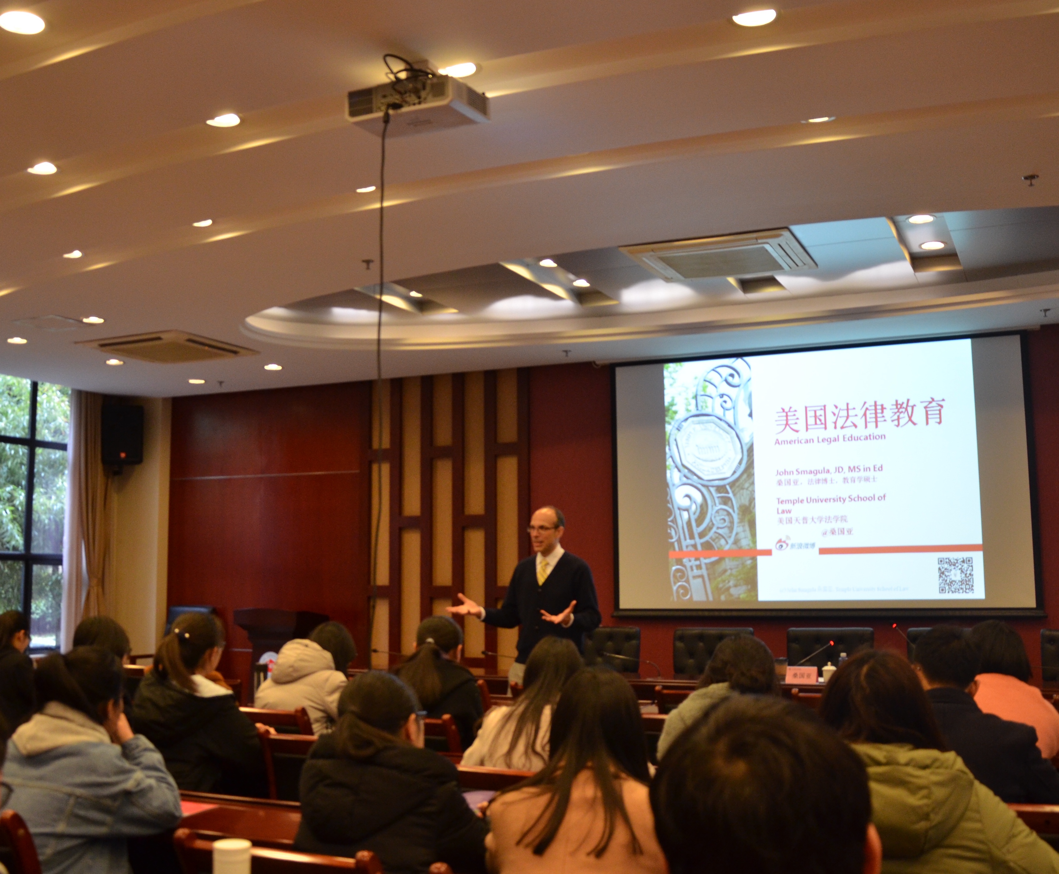 会后,桑国亚为我校师生做了题为《美国法律教育体系及发展趋势》的讲座,讲座由国际交流处副处长张正怡主持。桑国亚从具体案例着手,讲授了法律思维分析方法和英语学习方法两方面内容,语言生动。本场讲座氛围活跃,同学们深受启发。