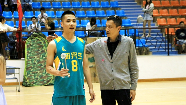 在中间的三分球表演赛中,来自各学院最优秀的射手们,在规定一分钟内于球场三分线的三个不同的点上进行投篮。来自社会管理学院的屠一鸣同学以最高命中率荣获三分王的称号。