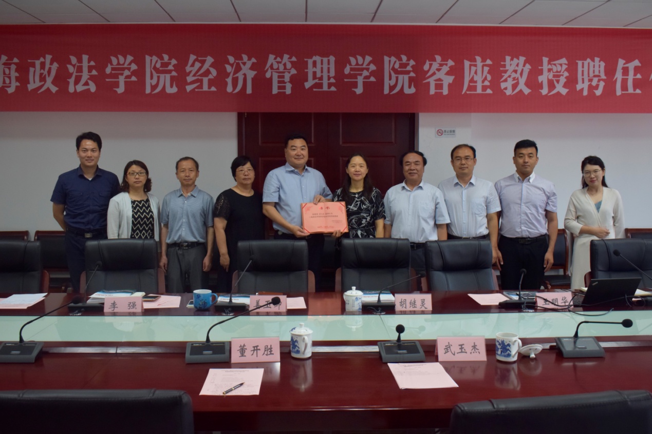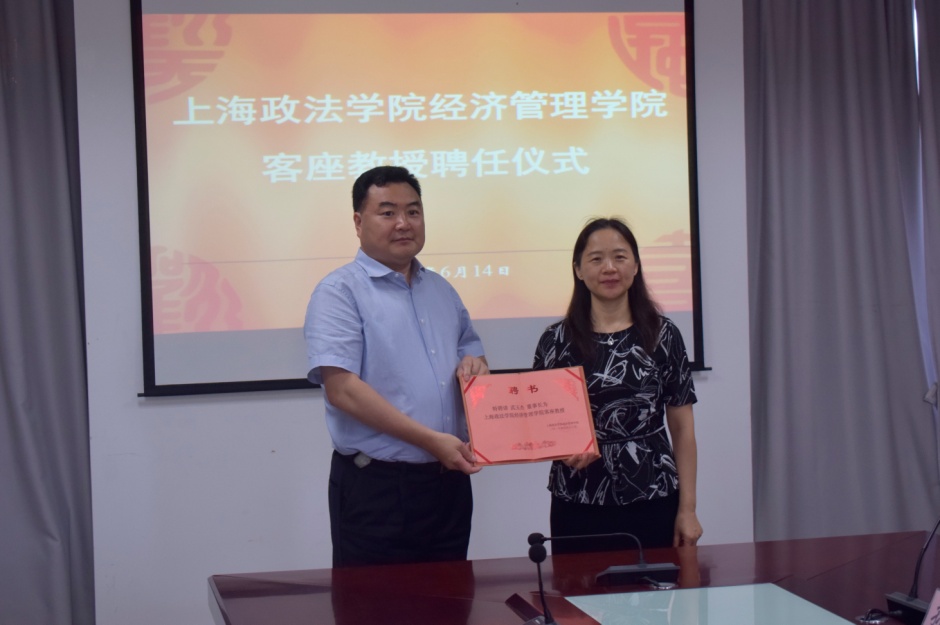 6月14日上午,经济管理学院在明文苑A3-201会议室举行客座教授聘任仪式,聘请国美酒业集团董事长武玉杰为客座教授。上海政法学院副校长胡继灵,经济管理学院院长王明华、党总支书记姜玉卿及教师代表出席仪式,姜玉卿主持仪式。