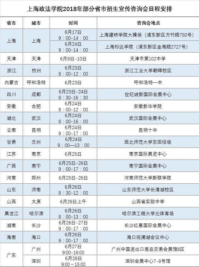 上海政法学院2018年部分省市招生宣传咨询会日程安排