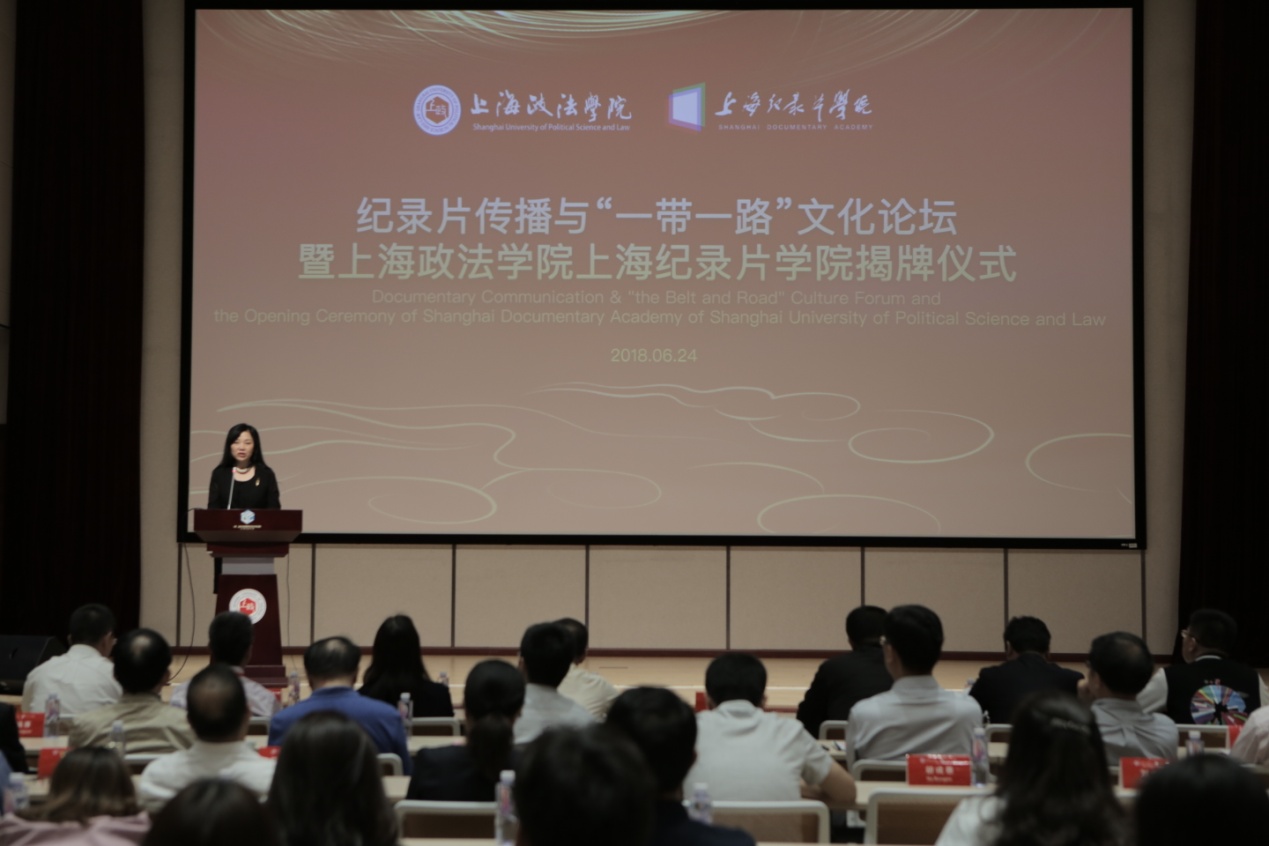刘晓红代表上海政法学院致辞,她指出,上海纪录片学院是学校顺应新时期我国新闻传媒行业的发展需求,聚集校内外优质的传媒教育资源,努力打造的一个旨在培养创新型、应用型和国际化传媒人才的特色学院,是我校探索办学机制、提升办学特色、创新人才培养的一次重大举措。