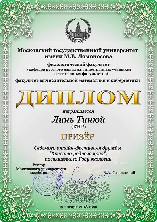 留学期间,我校学生积极参与了莫斯科国立大学、下诺夫哥罗德国立大学、下诺夫语言大学、下诺夫哥罗德建筑大学举办的各类活动和比赛,取得了优异的成绩。其中,周卓霖、林听雨同学在莫斯科国立大学全俄外国大学生“美丽俄罗斯”比赛中荣获二等奖,张晓妍同学荣获下诺国立语言大学作文比赛一等奖。