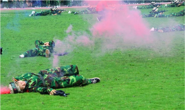 紧接着,从经济管理学院调160名精英学生组成红蓝两方进行步兵排平原进攻战斗演习,融合了战地扎营、构筑工事、战伤救护、平原攻防,以及战术基础动作等课目。首先,3个班在操场南侧演示的是战地扎营,另外3个班操场北侧同步开始构筑防御工事。战地防御搭建完毕后,红方蓝方分为进攻方和防守方同时跑步入场开始班排战术表演。红方作为进攻方,跃进、卧倒、匍匐,各种战术动作一气呵成,展开队形、正面猛攻、迂回包抄,各种攻击战法合理运用,突破了蓝方的一道道防线。最后,步兵排平原进攻战斗,以红方的全面胜利宣告结束。攻防期间,8名同学组成的医疗救护队担任“战场救护任务”,4名负责抬担架,2名负责射击掩护,到达伤员地域后,2名担架手检查伤势,迅速包扎后,并协力将伤员抬上担架,快速撤出场地。整个过程迅速有序,高质量地完成平原进攻战斗演习。
