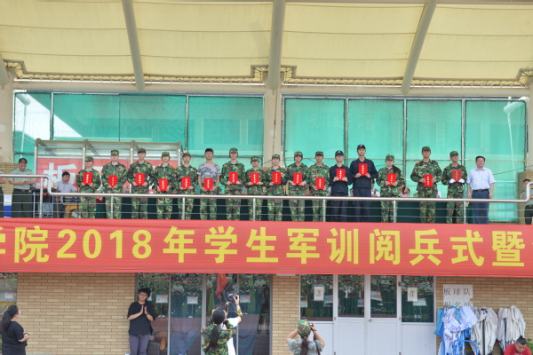 最后,进行表彰仪式。刘刚宣读了我校2018年军训表彰名单。本次军训共评出优秀阅兵优胜集体15个,优秀军容军姿集体10个,“反恐对抗”优胜集体和“野外生存”优胜集体、手抄报优秀集体各3个,优秀排长(辅导员)13名、军训先进学员245名等。校领导分别向获胜集体和个人,以及密切配合我校军训工作的北京砺刃教育科技有限公司、各后勤保障部门赠送了锦旗。