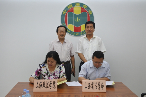 秦伟与侯怀霞签署《山西省法学会与上海政法学院开展合作原则协议》。