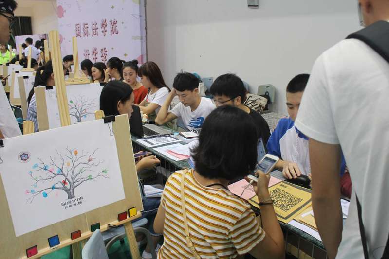国际法学院迎新工作中新增“砥砺前行的指纹树”,每位新生同学在本班级的指纹树上留下属于自己的指纹,组成一棵完整的、五彩的指纹树,寓意同学们一起砥砺前行,众志成城、团结一致,凝心聚力。国际事务与公共管理学院为18级萌新们特别设计了迎新手袋,制作迎新展板——拾捌 遇你。拾捌,谐音十八;遇你,则是国务与新生的相遇,也是“与你”的谐音,代表国务与大家携手同行。经济管理学院搭建“蓝色梦想之门”,跨过梦想门,从此经管人,为新生同学筑起启航梦。经济法学院将内部装有五彩水养球许愿瓶的送给新生们的小礼物。在完成新生报道流程后,每一位新生都会领取到一个属于自己的许愿瓶。大家可以把自己想说的话写在纸上,塞进许愿瓶里,用细线绑住封存起来。无论是梦想,还是希望,或是祝福,都由小小的许愿瓶来承载。