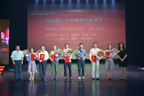 校党委书记夏小和、校长刘晓红共同为从教三十年教师代表颁发荣誉证书,他们是:信息化工作办公室杨田宏、计算机教学部欧阳为民、国际事务与公共管理学院谈谭、研究生处邓雯萍、继续教育学院谢志为、后勤保障处谭翔、图书馆罗健。三十年来,他们以情育人,脚踏实地,岁月如歌。