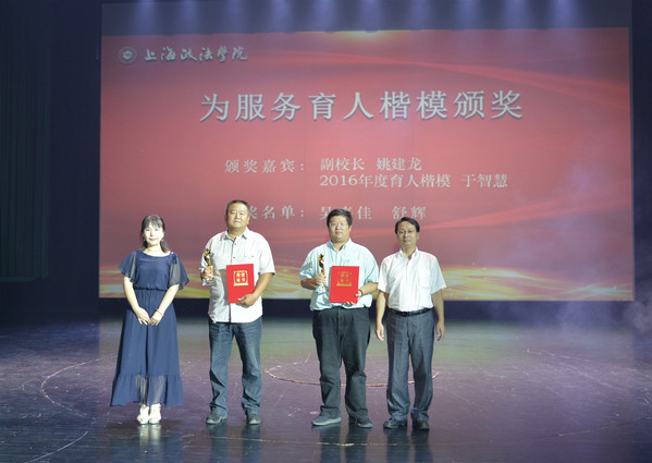2016年度育人楷模于智慧宣读2018年度服务育人楷模颁奖词,获奖的是保卫处舒辉与后勤保障处吴嘉佳,副校长姚建龙与于智慧共同为获奖人颁奖。吴嘉佳致获奖感言,表示将在今后的工作中把这份荣誉传承下去,全力做好后勤保障和服务工作。