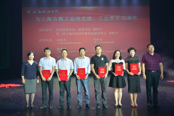 第二届上海高校青年教师竞赛获奖人周秋君宣读市教卫系统党建、工会类奖项颁奖词,获奖代表分别是马克思主义学院刘旭光(第三届上海高校青年教师教学竞赛决赛思想政治理论课三等奖)、警务学院储德峰(教卫工作党委系统“党支部建设示范点”)、马克思主义学院徐俊峰(教卫工作党委党建研究课题)、保卫处马洪亮(教卫工作党委党建研究课题)、国际事务与公共管理学院张丽艳(教卫工作党委系统“十佳主题党日”案例)、经济法学院叶卉(统战研究课题)。校党委副书记、纪委书记潘牧天与周秋君共同为获奖人颁奖。刘旭光致获奖感言,感慨教书育人给自己带了很多的成就感,课堂上学生会心的一笑都会让自己回味许久,今后将勤勉工作,牢记教书育人使命。张丽艳分享了国际事务与公共管理学院党建项目的特色,表示将继续坚持“两学一做”,做到“一个学生一面旗”,充分发挥党员先锋模范作用。