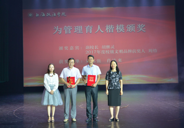 2017年校级文明品牌获奖代表周怡宣读2018年度管理育人楷模颁奖词,获奖的是经济管理学院刘志强和发展规划处肖诗来,副校长胡继灵与周怡共同为获奖人颁奖。刘志强致获奖感言,表示要将管理与教学工作形成合力,让教师成为社会文明进步的阶梯。