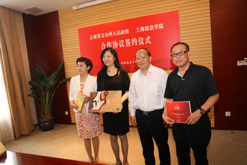 9月19日,上海政法学院与云南省文山州人民政府合作协议签约仪式在我校隆重举行。云南省扶贫办党组成员、副主任、文山州委常委、副州长李新,我校校长刘晓红,文山州副州长玉荣出席签约仪式,校党委副书记、副校长刘刚主持仪式。文山州司法局局长罗荣,文山州文广体局局长王毅,文山学院人文学院党总支书记陈世荣,文山州委教育工委专职副书记、州教育局副局宋子宁,文山州教育局办公室副主任王俊,我校党办校办主任、宣传部长高志刚,发规处处长、学科办主任、高教所所长石其宝,上海纪录片学院戴元光教授,合作发展处处长王晓宇,图书馆馆长王明华,继续教育学院院长马小娜,校团委书记陆嵬参加活动。
