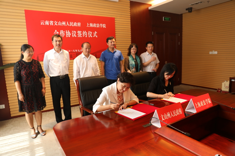 9月19日,上海政法学院与云南省文山州人民政府合作协议签约仪式在我校隆重举行。云南省扶贫办党组成员、副主任、文山州委常委、副州长李新,我校校长刘晓红,文山州副州长玉荣出席签约仪式,校党委副书记、副校长刘刚主持仪式。文山州司法局局长罗荣,文山州文广体局局长王毅,文山学院人文学院党总支书记陈世荣,文山州委教育工委专职副书记、州教育局副局宋子宁,文山州教育局办公室副主任王俊,我校党办校办主任、宣传部长高志刚,发规处处长、学科办主任、高教所所长石其宝,上海纪录片学院戴元光教授,合作发展处处长王晓宇,图书馆馆长王明华,继续教育学院院长马小娜,校团委书记陆嵬参加活动。