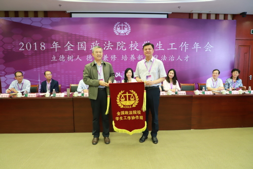 刘刚代表上海政法学院向2019年全国政法院校学生工作年会承办单位山东政法学院交接了全国政法院校学生工作协作组会旗。张振智做了表态发言,并向各兄弟院校发出了“2019相聚泉城济南”的年会邀请。
