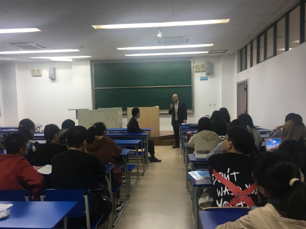 会见结束后,Mark Koulen于庸夫楼206室开展了题为“世界贸易组织与国际经济法律制度”的讲座,向学生阐释了多边贸易体系面临的现状以及面临的挑战,未来的中美关系以及世贸组织改革与贸易协定。讲座后,Mark Koulen热情解答学生问题,并就一带一路、世贸组织、跨太平洋伙伴关系协定等相关问题提出了独到见解。