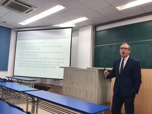 11月14日下午,Alastair Mullis为我校学生开展了题为“国际买卖合同法律的多元化:《国际货物销售合同公约》与英国法”的专题讲座,介绍了国际销售合同公约的产生背景和内容,并从英国未批准公约的原因、英国相关法律与条约规定的对比中分析了国际销售公约内容的缺陷以及适用中存在的问题,同时结合自身多年研究分析公约存在的合理性。在场学生与Alastair Mullis展开积极讨论,并就利兹大学法学项目进行咨询,现场气氛热烈,互动良好。