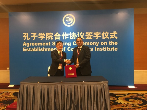 第十三届全球孔子学院大会于12月4至5日在成都举行。国务院副总理、孔子学院总部理事会主席孙春兰出席大会开幕式并致辞。教育部部长、孔子学院总部理事会副主席陈宝生主持大会开幕式。我校与印度金德尔全球大学合作的“汉语言培训与研究中心”项目在大会上举行了签字仪式。我校党委副书记吴强率团出席大会和签字仪式,国际交流处处长、国际交流学院院长欧阳美和,国际交流处王瑶等参加了有关活动。