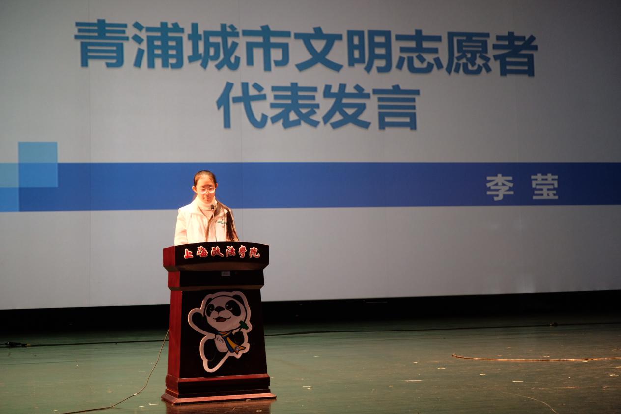 表彰仪式上,朱慧博作我校首届中国国际进口博览会志愿者服务组织工作总结,与会领导嘉宾为志愿代表赠送纪念品。会期志愿者代表蒋嘉骏、青浦城市文明志愿者代表李莹、仿真演练志愿者代表杨朝森作交流发言。
