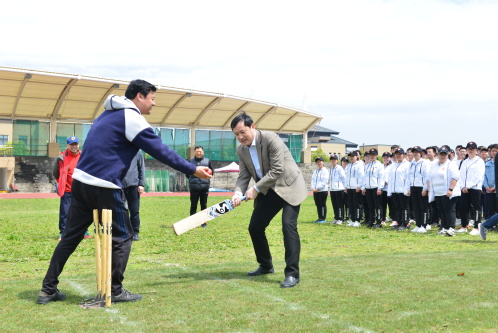 刘刚在板球友谊赛开幕式上致辞,对华政校领导和板球队的到来表示热烈欢迎,两校同是政法院校,在地缘上又相邻,希望能以板球为纽带,为两校的合作发展锦上添花。周立志表示,希望两校友谊长存,预祝板球友谊赛圆满举行。两校领导共同为板球友谊赛开球并与大家合影留念。