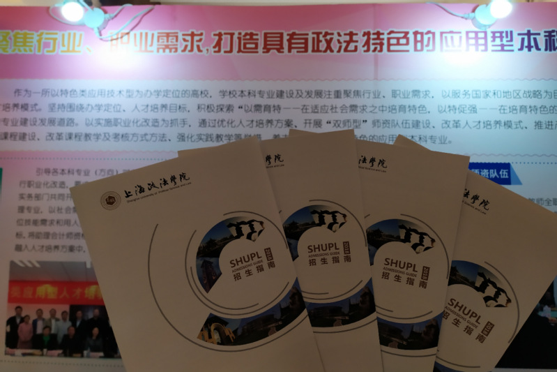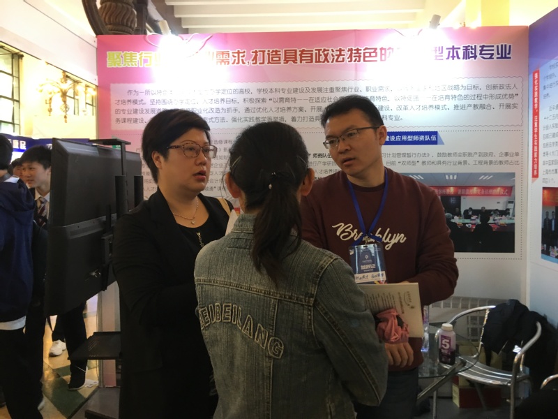 我校展区位于展示区域的中心通道处,人流密集。通过图文展板、视频播放、材料发放咨询接待的形式,集中展示了我校以实施职业化改造为抓手,通过优化人才培养方案、开展“双师型”师资队伍建设、改革人才培养模式、推进产教融合、开展实务课程建设、改革课程教学及考核方式方法、强化实践教学等举措,着力打造具有上政特色的应用型本科专业。
