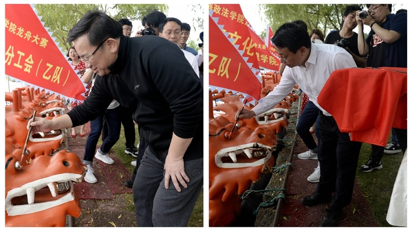 和煦夏阳,微风轻拂。开幕式上,姚建龙代表学校致辞,对本次龙舟大赛的成功举办表示热烈祝贺,对为赛事付出辛勤努力的工作者表示衷心感谢。希望上政师生在传承与发扬中华民族传统文化的同时更要发扬上政人敢于拼搏、勇立潮头的精神,在今后的学习工作中奋发有为、开拓进取,始终踏浪前行、迎难而上。夏小和、姚建龙和嘉宾共同为比赛龙舟点睛,为运动员加油助威,并与参赛师生一起观看精彩赛事。