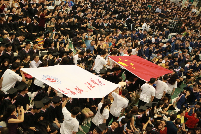 典礼开场前,全场毕业生传递国旗、齐唱 “我和我的祖国,一刻也不能分割,无论我走到哪里,都流出一首赞歌……”,饱含深情的歌声唱响了对祖国的赞歌,表达了拳拳赤子之心。