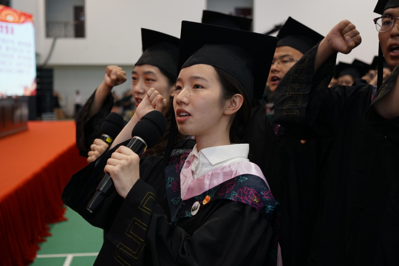 典礼开场前,全场毕业生传递国旗、齐唱 “我和我的祖国,一刻也不能分割,无论我走到哪里,都流出一首赞歌……”,饱含深情的歌声唱响了对祖国的赞歌,表达了拳拳赤子之心。