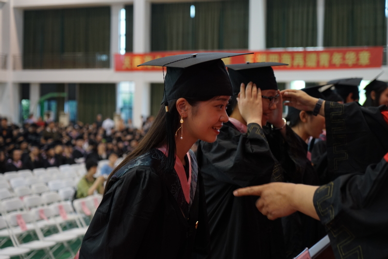 最后,校领导与学位评定委员会委员为毕业生正冠拨穗、授予学位。