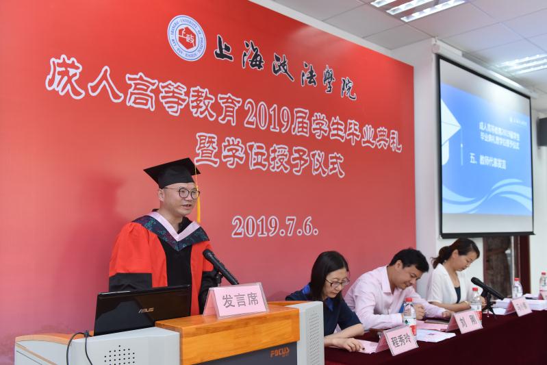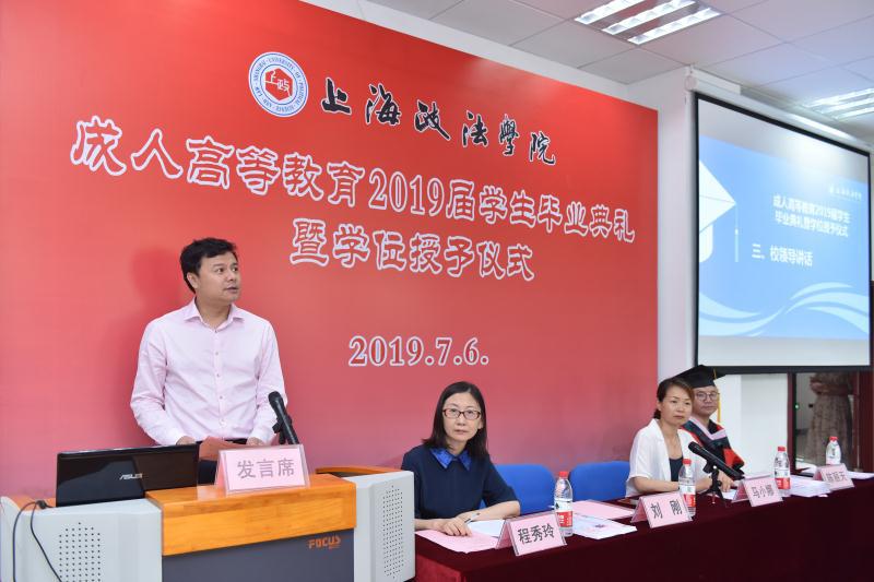 7月6日上午,上海政法学院2019届成人高等教育学生毕业典礼暨学位授予仪式在普陀校区隆重举行,党委副书记、副校长刘刚出席毕业典礼并讲话。毕业典礼由继续教育学院院长马小娜主持,教师代表、各学习站点负责人、班主任以及教学管理人员与2019届成人高等教育毕业生一起参加仪式。