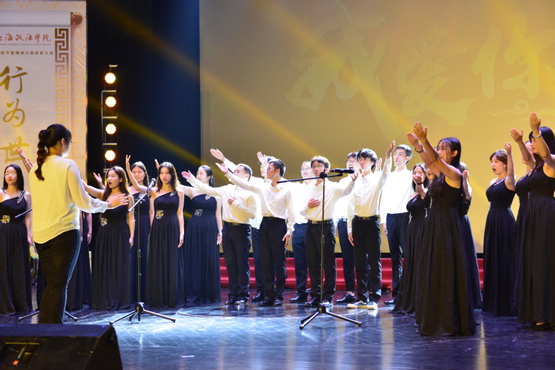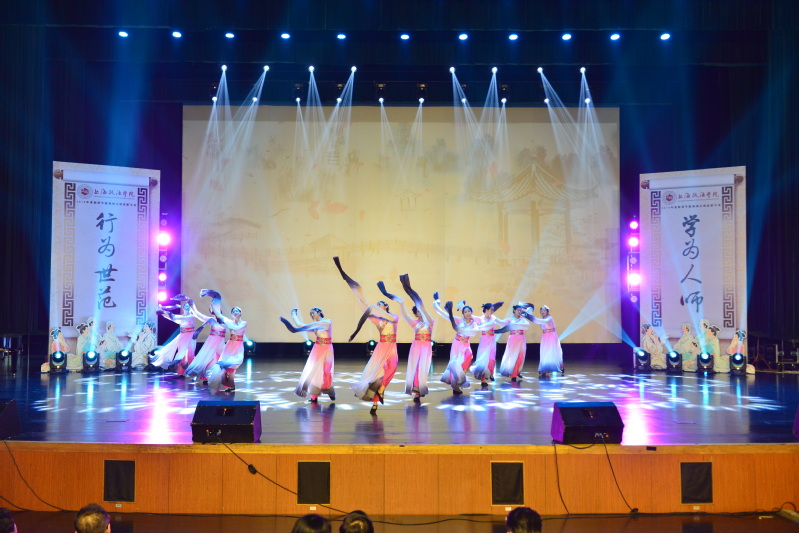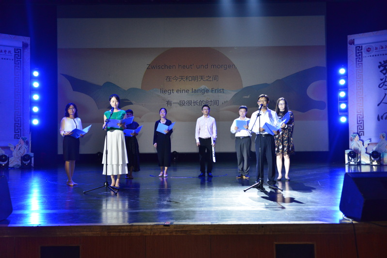 教工舞蹈团表演了古典舞《采薇》。语言文化学院教师用七国语言诗朗诵,并现场展示“教育报国守初心、立德树人担使命”的书法作品。