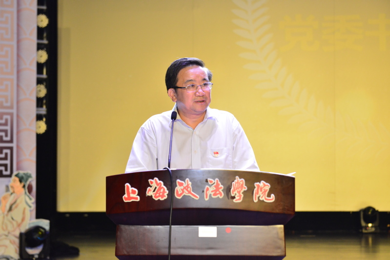 赵运锋宣读上海政法学院学术精英和学术新秀颁奖辞。党委书记夏小和为学术精英代表关保英和学术新秀袁小玉、张弛颁奖。他们背起“坚持”的行囊,脚踏实地、勇敢登攀。他们提着“理想”的灯火,志存高远、望尽天涯。获奖代表关保英致辞。
