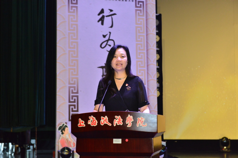 育人楷模肖诗来宣读上海政法学院优秀教师思政品牌颁奖辞。副校长胡继灵和肖诗来为优秀教师思政品牌负责人——政府管理学院连淑芳、上海纪录片学院刘孟贤、刑事司法学院胡冠时、语言文化学院姚善英颁奖。思政教育要有虚有实、有棱有角、有滋有味、有情有义,才能增强话语厚度、力度、黏度和温度。他们严格牢牢把握了思政教育的主动权,让“有意义”与“有意思”同向发力。获奖代表姚善英致辞。