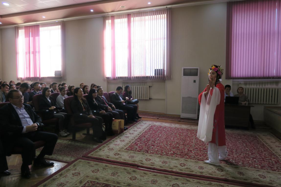 在吉尔吉斯斯坦国立民族大学,代表团受到了该校副校长杰米洛夫的热情迎接。该校国际关系与东方研究院学生为代表团表演了汉语诗歌朗诵、电影红高粱主题曲伴舞、中国剑术、中国京剧等节目。胡继灵在致辞中称赞吉尔吉斯斯坦国立民族大学学生在汉语学习上取得的成绩,鼓励他们继续学好中文,欢迎吉国师生来上海政法学院深造、交流、访问。双方在本科生互换交流、联合培养研究生、互聘导师、成立联合科研中心等方面达成共识,并约定尽快启动校际合作项目。