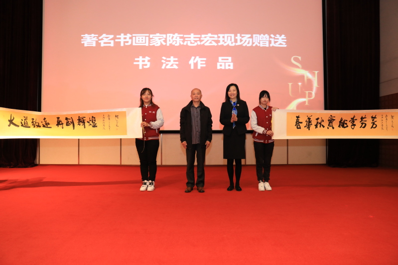 著名书画家、学校客座教授陈志宏赠送为学校创作的两幅书法作品——“春华秋实、桃李芬芳”和“大道致远、再创辉煌”。刘晓红代表学校接受馈赠。