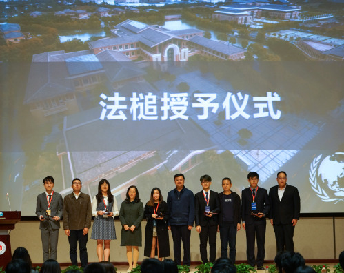 来自江苏警官学院、华东理工大学、华东政法大学、井冈山大学、上海对外经贸大学、上海商学院、西北工业大学明德学院、上海政法学院的各高校代表团代表接受了与会嘉宾赠送的纪念品和徽章。与会嘉宾为各学术代表团授法槌。