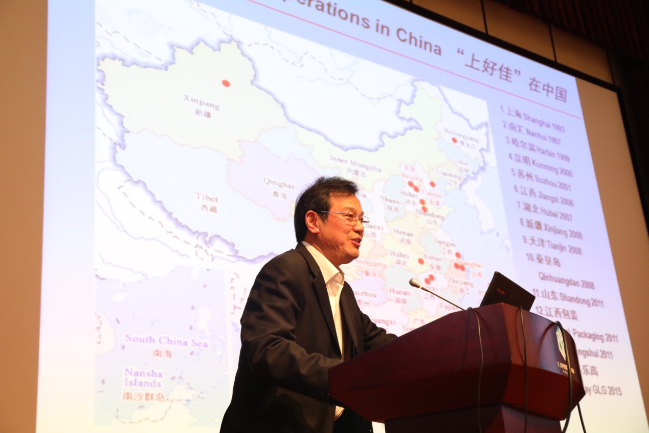 上好佳(中国)有限公司执行副总裁李培明作题为《“一带一路”如何促进企业的进一步发展》的报告,分享了上好佳公司从1993年成立,如何发展成分布9个国家共29个公司的成长历程。