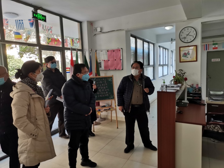 2月5日下午,市教卫党委副巡视员杨伟人、市教委国际交流处副调研员葛静怡赴我校检查指导疫情防控工作。校党委书记夏小和,党委常委、宣传部部长、党办校办主任高志刚,学校总值班、政府管理学院总支书记连淑芳,国际交流学院副院长、留学生办公室副主任周怡、后勤保障处副处长祝耀明、保卫处副处长陆嵬陪同检查。