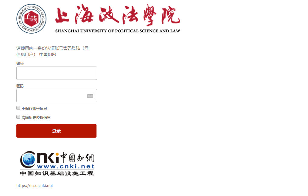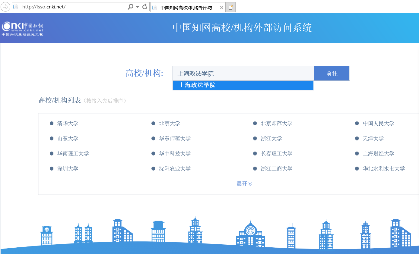 1.访问网址:http://fsso.cnki.net,在页面上的“高校/机构”输入框里输入“上海政法学院”,点击“前往”。