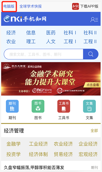 3.如果通过手机/平板访问,输入账号、密码验证身份后,请点击知网页面左上角“电脑版”,即可访问知网CNKI数据库的学术资源。