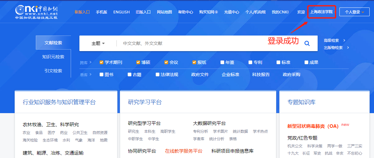 2.跳转至“上海政法学院”统一身份认证界面,输入账号、密码,通过验证后,就可以顺利访问知网CNKI数据库的学术资源。