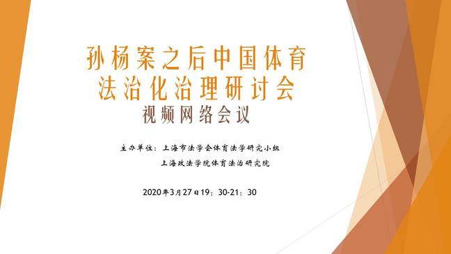 3月27日晚,由上海市法学会体育法学研究小组、上海政法学院体育法治研究院举办的“孙杨案之后中国体育法治化治理”研讨会通过网络视频的方式举行。本次研讨会主要以长三角地区的专家、学者、律师为主,来自中国法学会体育法学研究会、上海市法学会、上海体育科学研究所、长三角地区各大高校及律师事务所等单位共85名专家学者参加了会议。研讨会由上海市法学会体育法学研究小组副组长、上海政法学院体育法治研究院院长谭小勇教授主持,上海市法学会体育法研究小组组长、上海政法学院副校长胡继灵教授和中国法学会体育法研究会会长刘岩致辞,南京体育学院副校长李江教授莅临会议。