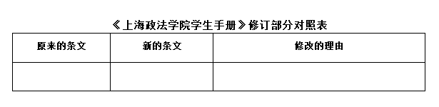 4.各相关职能部门应指定专人负责,请将校正之后的版本、修订对照表经编撰部门负责人签字后,于5月22日(星期五)前将纸质版1份交至学生工作部,电子版发送至指定邮箱。