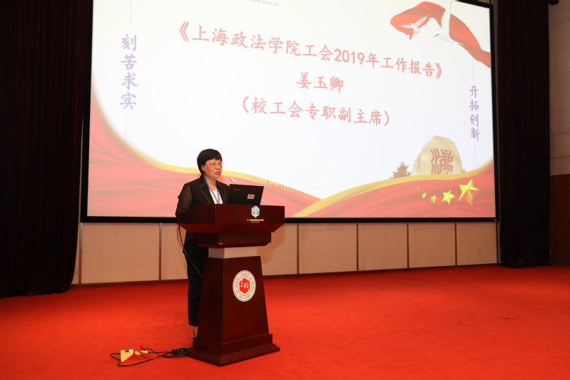校工会专职副主席姜玉卿作题为《勇于担当、锐意进取,矢志建功新时代》的上海政法学院工会2019年工作报告,总结校工会在加强政治建设、参与民主管理、服务教职工、推进校园文化建设及工会自身建设方面取得的成绩,规划了2020年的工作:一是继续推进民主管理,健全各项工作制度;二是营造良好氛围,加强师德师风建设;三是维护教职工权益,解决教职工诉求;四是加强校园文化建设,培育品牌化工会活动项目。