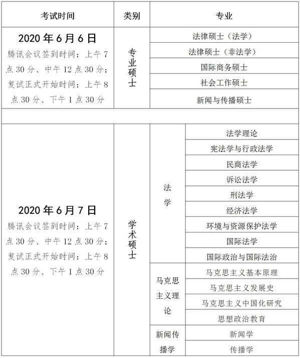 上海政法学院2020年硕士研究生招生复试将于2020年6月6日(专业学位)、6月7日(学术硕士)进行,请各位复试考生按类别专业于当天上午7点30分、中午12点30分到考务人员通知的腾讯会议平台进行签到。