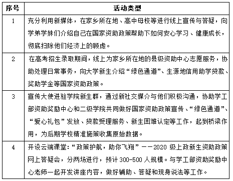 (五)9-10月,中心负责召开本校2020年暑期学生资助宣传大使工作总结会,开展本校优秀学生资助宣传大使评选。