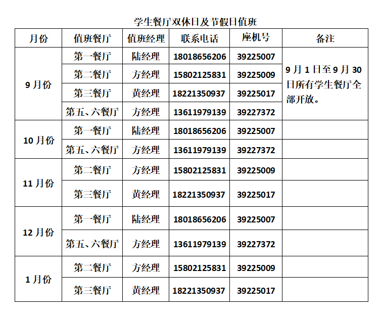 备注:如有不确定因素需要调整值班食堂的,以接到综合服务科书面通知为准。